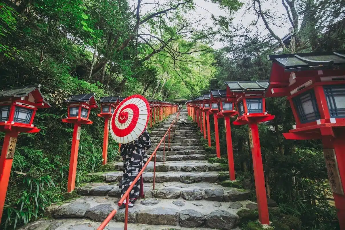 夏天消暑的川床流水麵、秋天楓葉點綴的燈籠參道、冬天白雪覆蓋的點燈階梯,前往貴船神社必搭的「叡山電車」沿線還有天狗傳說的鞍馬寺及楓葉季浪漫無比的叡山電車夜間楓葉隧道,適合想安排放鬆接觸大自然美景的京都景點。